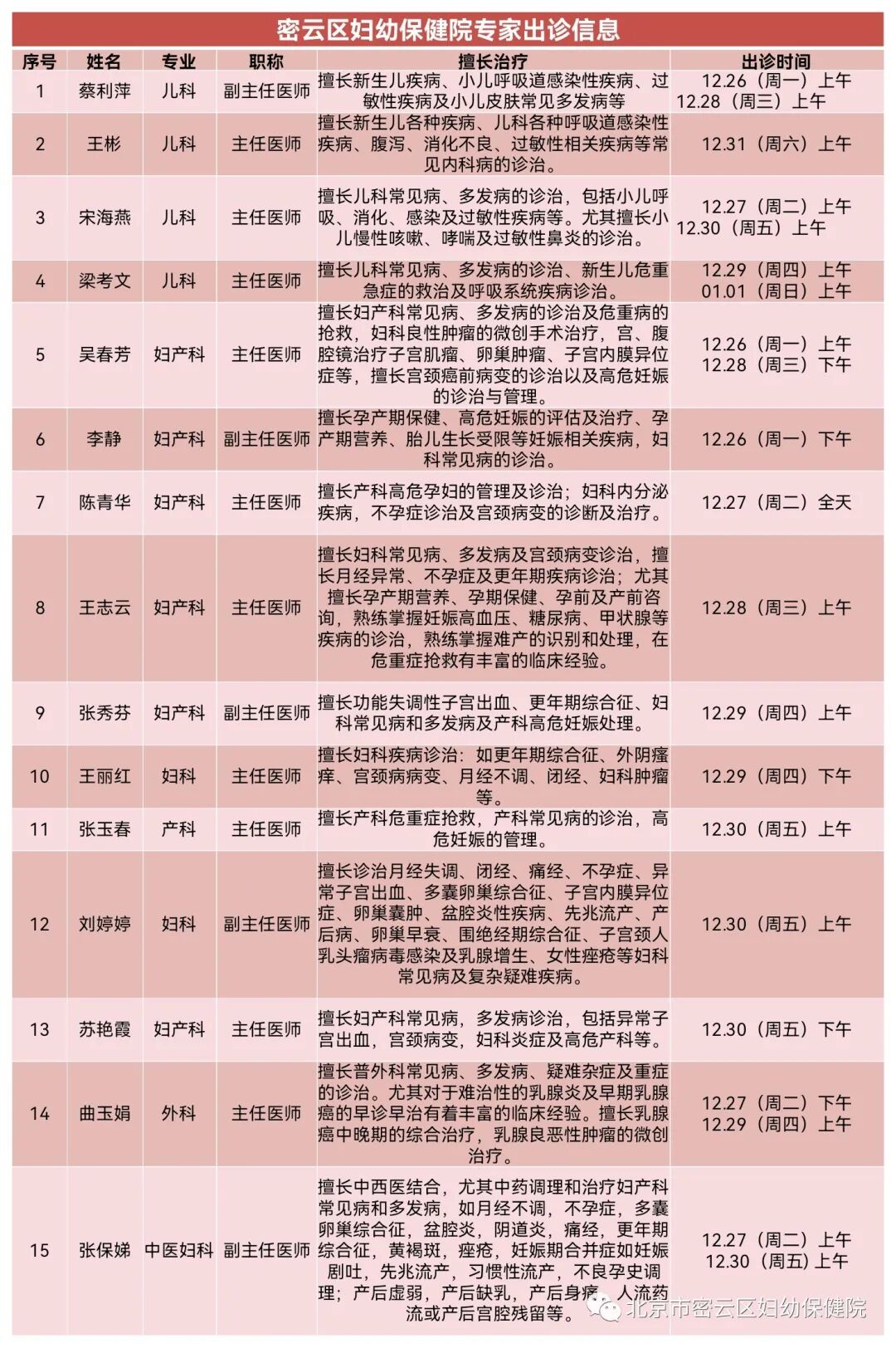 密云区妇幼保健院专家出诊信息(2022.12.26-2023.01.01)