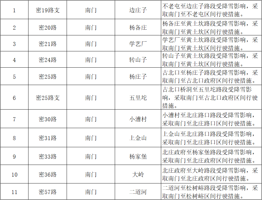 2、南门场站16条(采取停驶线路4条、区间行驶线路11条、绕行线路1条)